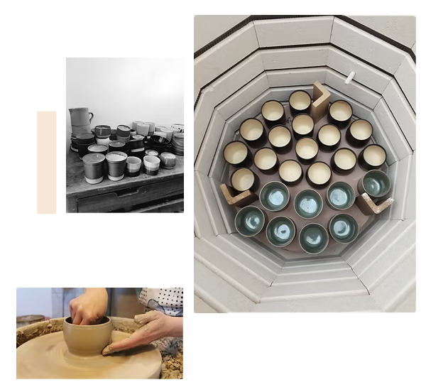 Luego del torno la pieza se deja secar, pero no del todo, para después poder retornearla, sacando de la base su excedente. Cuando la pieza está seca, se mete al horno a quema de bizcocho por 7 horas, alcanzando hasta los 950ºC. Luego, se esmalta y se lleva nuevamente al horno, a una quema de alta, por 10 horas, que alcanza los 1.260° C.